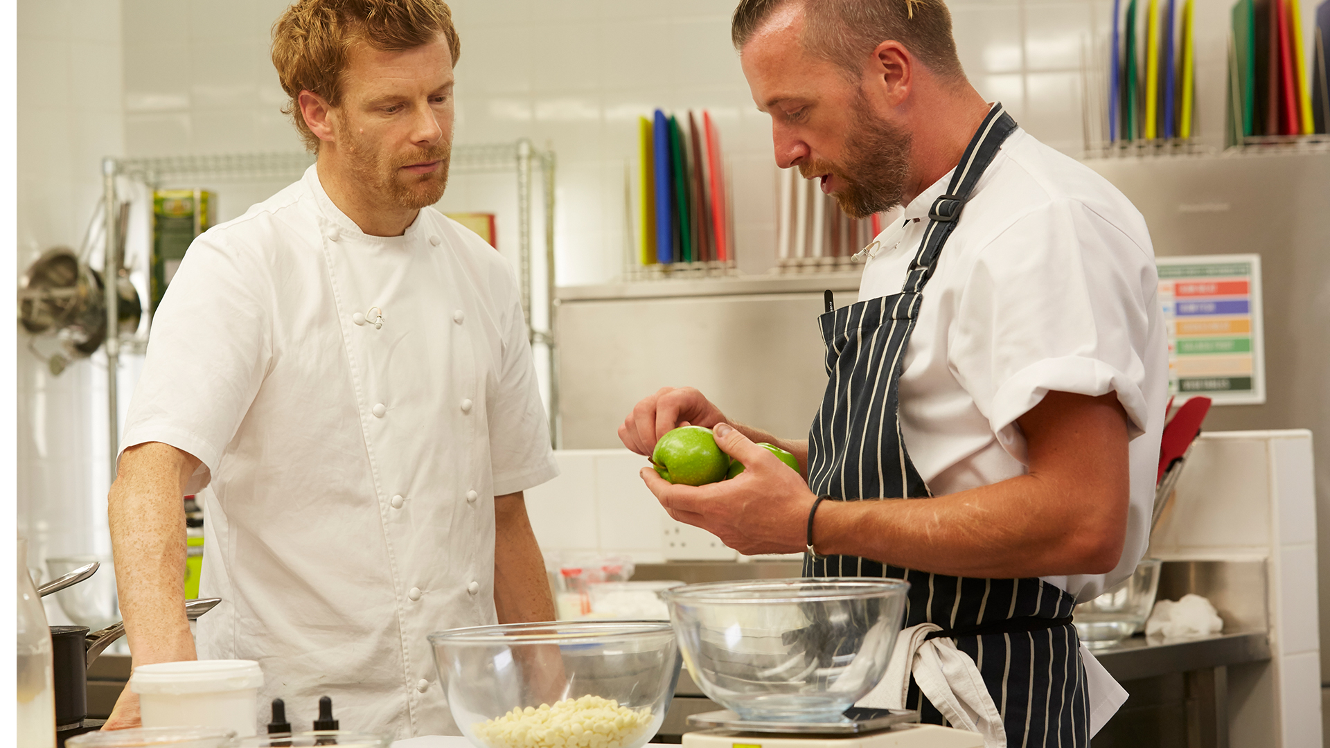 It’s the dessert course and the last chance for the chefs to secure a place cooking for the judges so all three chefs are feeling the pressure. Phil Carmichael creates a tennis ball dessert that combines two British classics; Eton mess and trifle.